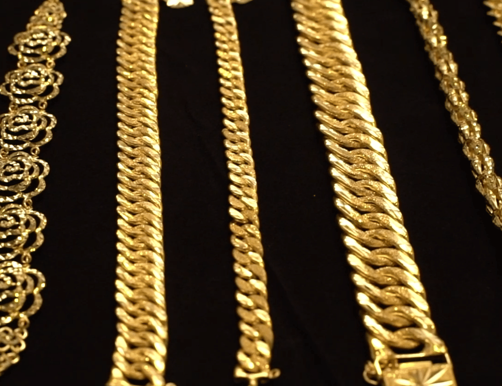 Value-added gold chain – A combination of machine-made and hand-made chain where several chain designs are fabricated and attached to one another to create an aesthetic design. Pendants or charms may also be attached to the gold chain and are sold as part of the design of the gold jewellery product. Generally, we charge a higher workmanship fee for these types of gold chain products.